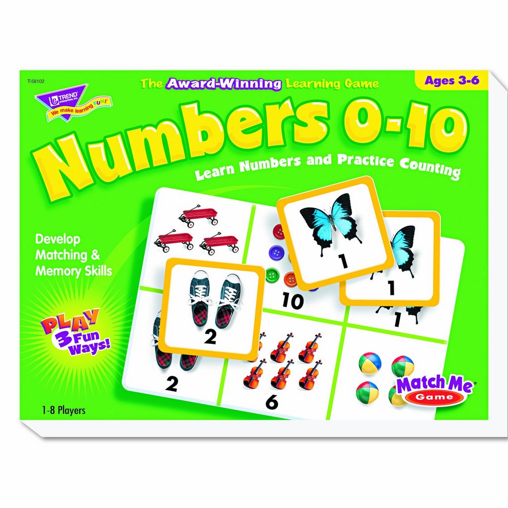 Plays like Lotto! Young learners quickly build matching and memory skills as they play this award-winning Match Me Game. Teach numbers 0 to 10 by presenting numerals and counting equivalent sets of photographed objects. Eight two-sided game boards facilitate growing skills and keep kids engaged. They feature photographs and numbers on front; numbers on back. Pieces are extra sturdy for learning fun. 1 to 8 players. Play 3 ways. Includes 48 game pieces, activities, and a sturdy storage box.