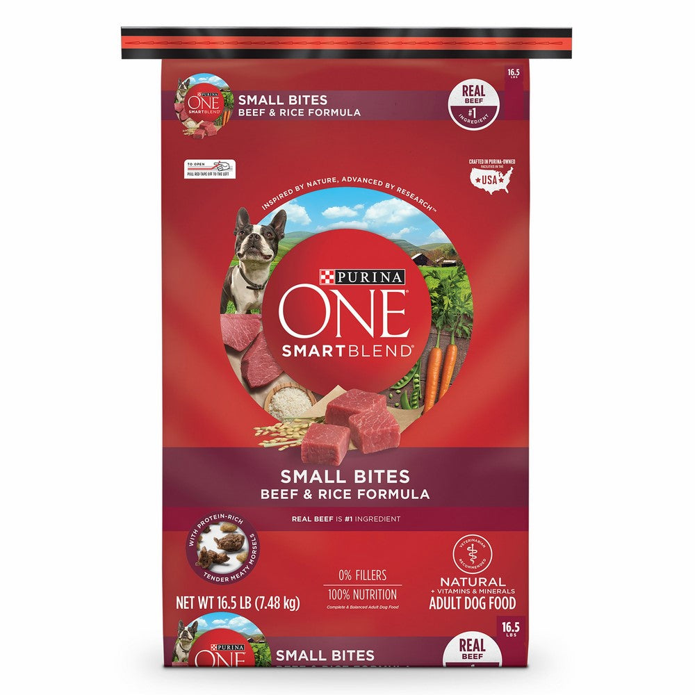 16.5 lb. Bag- Purina ONE SmartBlend Natural Small Bites Beef & Rice Formula Adult Dry Dog FoodReal beef is the #1 ingredientAntioxidant blend to help support a strong immune systemNatural sources of glucosamine to promote joint healthOmega-6 fatty acids help support healthy skin and coat
