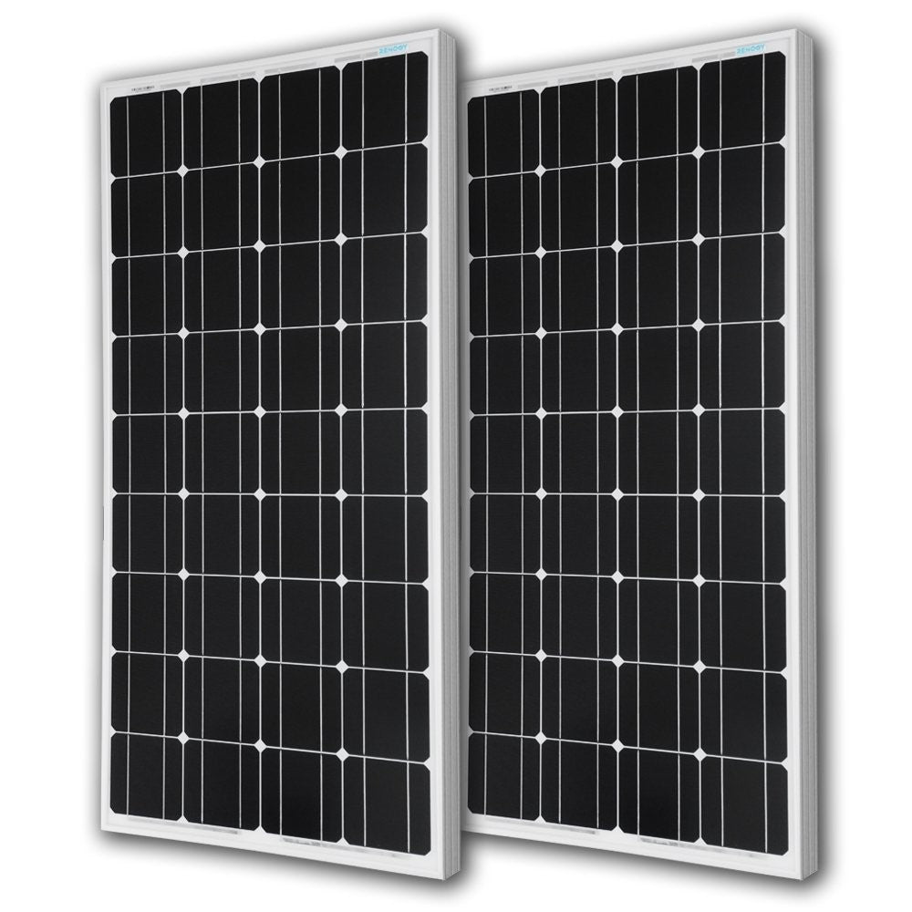 Two pieces of Renogy 100-Watt Monocrystalline solar panelAdvanced encapsulation material with multilayered sheet laminations to enhance cell performance and provide a long service lifeCorrosion-resistant aluminum frame for extended outdoor use, allowing the panels to last for decades as well as withstand high winds (2400Pa) and snow loads (5400Pa)Anti-reflective, high transparency, low iron-tempered glass with enhanced stiffness and impact resistanceBypass diode minimizes power drop caused by shade and ensures excellent performance in low-light environments