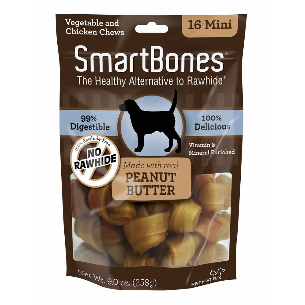 SmartBones have absolutely NO RAWHIDE in them. They are made with wholesome vegetables & REAL chicken. This makes SmartBones highly digestible, and highly palatable. They are also enriched with vitamins & minerals…making them much healthier for dogs than any rawhide chew! SmartBones Have All the Benefits of a Rawhide Chew...WITHOUT the RAWHIDE! NO RAWHIDE SmartBones are made with REAL PEANUT BUTTER, CHICKEN and wholesome VEGETABLES for a scrumptious taste dogs can't resist! Give your pup a chew that helps maintain healthy teeth and gums through the natural action of chewing, while also providing flavor they love. SmartBone Peanut Butter Mini Bones are enriched with vitamins and minerals and perfectly sized for your small dog. They'll love the vegetable and peanut butter outside and delicious chicken inside; as they chew on a classic knotted bone treat. Mini Bones are 2.5” and great for dogs 5-10 lbs. Each pack contains 16 mini bones.