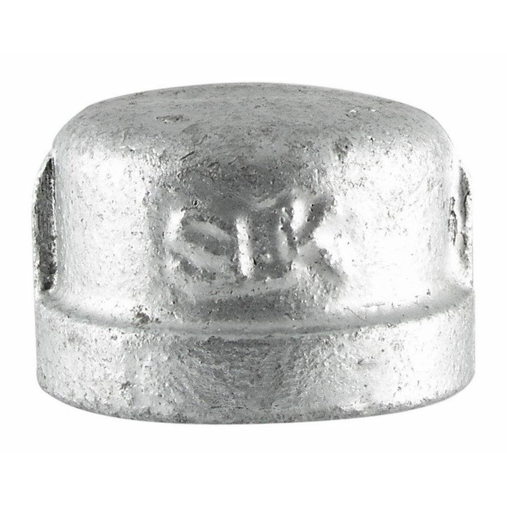 Galvanized Pipe Cap - Galvanized malleable iron. Each fitting is individually flag tagged. Import. Mueller logo cast into body of each fitting. 100% inspected and quality tested. All fittings meet the following specifications: Material: ANSI/ASTM A-197 Dimensions: ANSI/ASME B.15.3, B16.14, B16.39. Threads: ANSI B1.20.1. - Size: 1", Material: Malleable Iron, Finish: Galvanized, Pkg Qty: 1