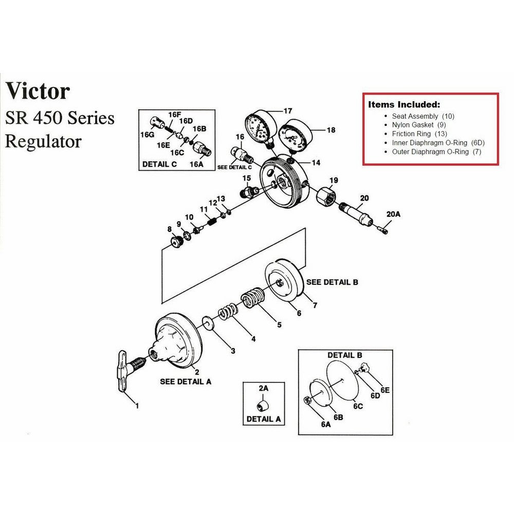 • 0790-0102 Features: -.-UNSPC CODE: 23171500.-Torch & Regulator Repair Parts Torch regulator Repair Parts welding gas equipment repair part regurator.-REPAIR KIT SR450 & VGS450.