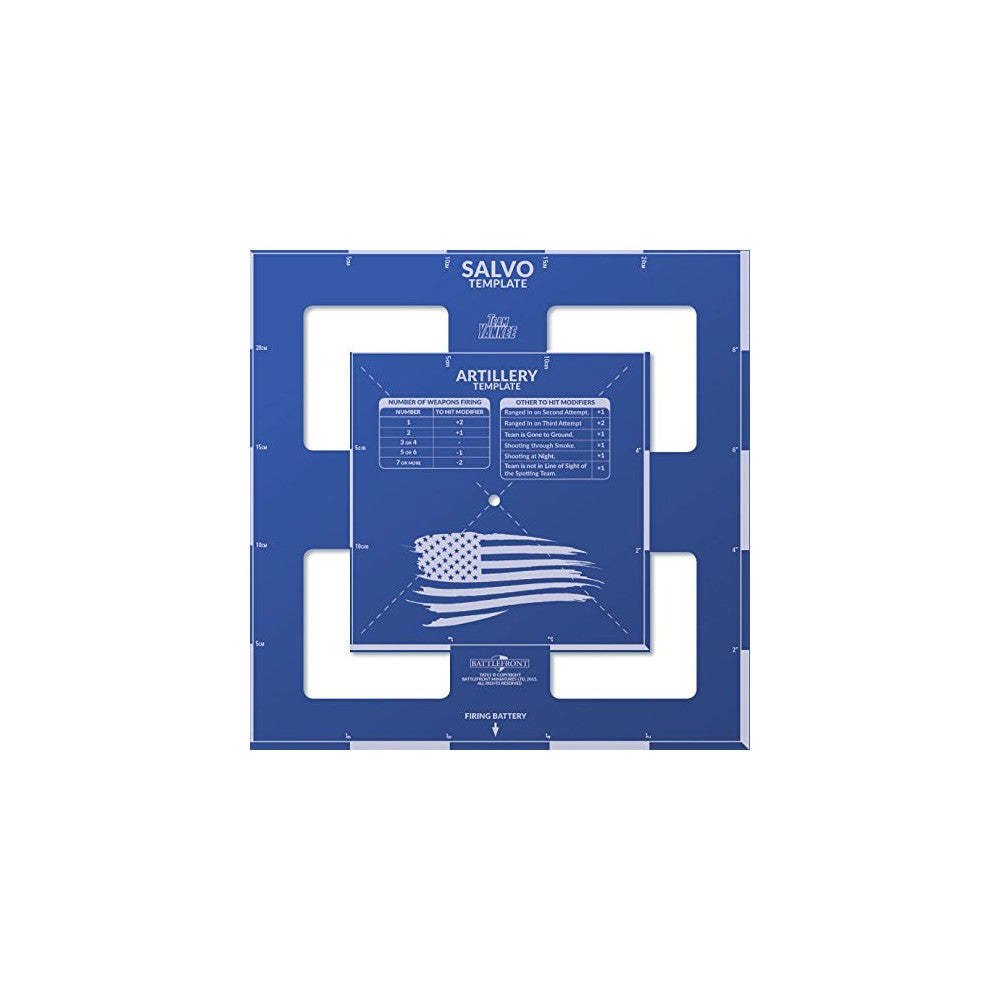 Team Yankee Template - US Edition - Battlefront Miniatures •On the Website: There are two sizes of template available in the game: Artillery (6"/15cm square) and Salvo (10"/25cm square) depending on the ROF rating of the weapons firing. This transparent laser-cut acrylic template integrates both sizes in one handy piece. •Package Info: -Product is for use in the Team Yankee Miniature table top game TAT01