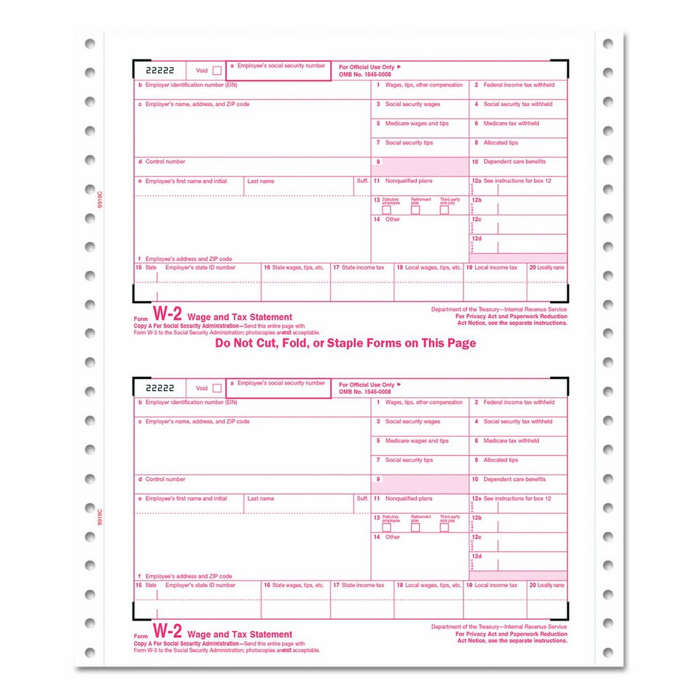 6-part continuous W-2 forms24 forms per packTwo forms per sheet9.5 x 11 inches, detached size 8.5 x 5.5 inchesIncludes one W-3 Summary Transmittal Form