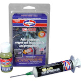 Uniweld P4KD9S aluminum soft solder kit with metal tip flux applicator is a great solution for the service technician who is frequently confronted with the task of repairing or joining aluminum to aluminum and aluminum to copper or brass. A common repair problem occurs when an air conditioning system's evaporator coil develops a small pinhole leak. P4KD9S is an excellent solution for this repair due to its low melting point of 500°F and 20,000 psi tensile strength. The kit comes with a 2 oz. bottle of flux, a 10 ft. coil of aluminum solder, and a metal tip flux applicator. The metal tip flux applicator makes it very easy to apply the flux in tight work spaces, and the metal tip makes it possible to add more flux if needed when the base metal is already hot without melting the applicator. This aluminum solder kit makes this job very simple to complete.