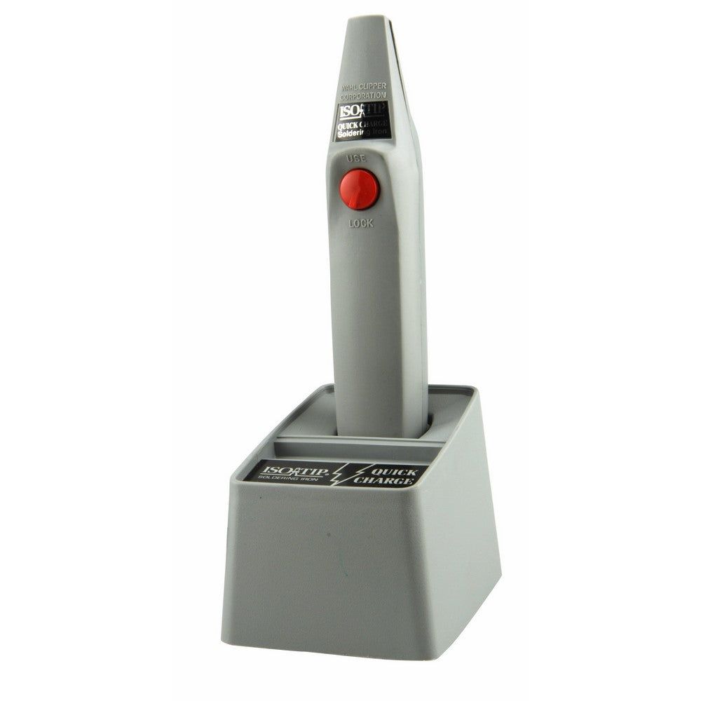 The Iso-Tip #7700 Quick Charge cordless rechargeable soldering iron has a lightweight and balanced design. The convenient lighted iron illuminates your work environment. Includes: solder iron (#7750), recharging stand (#7728-100), Ni-Cd battery, standard 1/16" diameter fine tip (#7545), standard 5/32" diameter heavy-duty tip (#7546) and instructions.