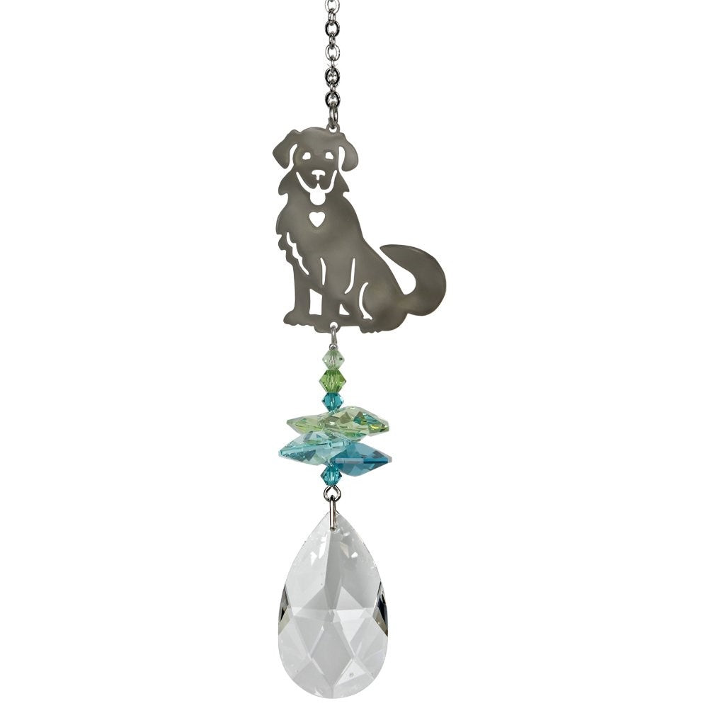 Woodstock's Crystal Fantasy Suncatchers feature laser-cut charms that add a touch of whimsy and adorn a colorful cascade of crystals ending with a clear crystal teardrop. A lovely gift for anyone, this will appeal especially to gardeners, hikers and anyonAccented with a laser cut silver-plated dog charmImported from the United KingdomGrammy award-winning musician and instrument designer Garry Kvistad and his wife Diane founded Woodstock Chimes after he created the first chime from an aluminum lawn chair he found in a landfillGenuine Austrian crystal suncatcher accented with a cascade of green crystals and a clear, faceted teardrop