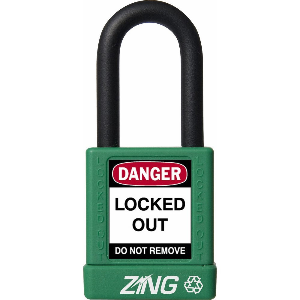 The Zing RecycLock lockout/tagout padlock, made from 70% recycled materials, has a solid aluminum body and steel shackle covered with plastic for corrosion resistance; retains its key until locked to ensure it is not left unlocked; and has a keyed alike 6-pin tumbler cylinder for security with single key convenience for use with multiple locks. Includes "DANGER: Locked Out Do Not Remove" label. This padlock is part of a lockout/tagout (LOTO) safety procedure required at facilities where a device or energy source needs to be isolated during maintenance and repair.